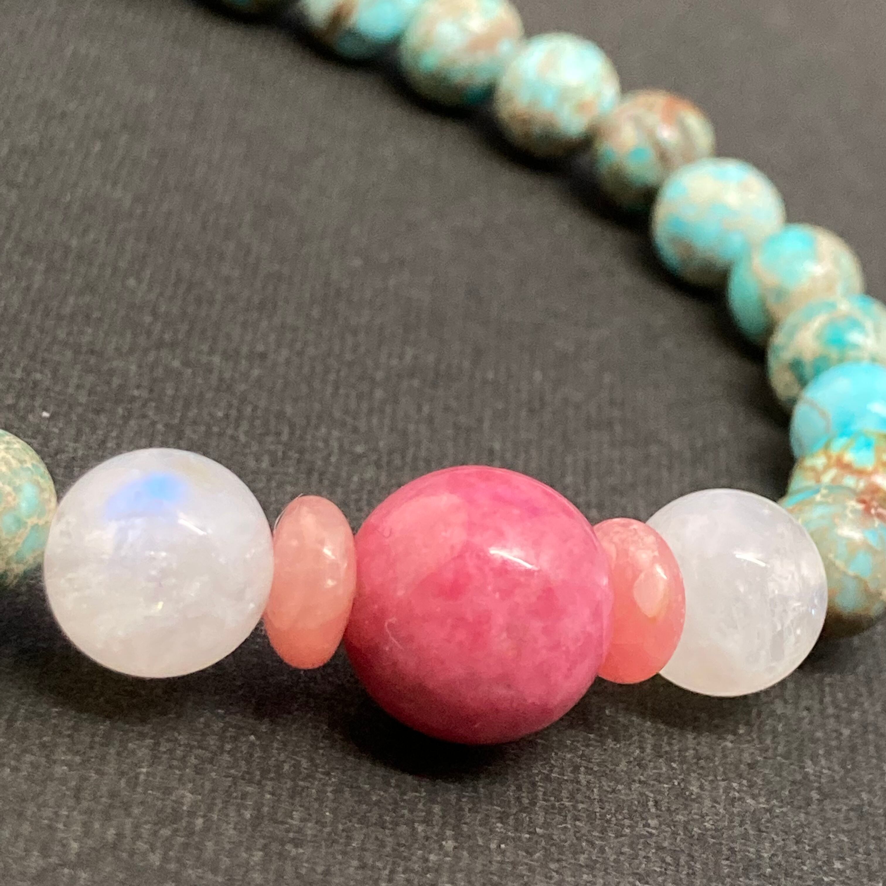 インスピレーションを高め、感受性を豊かにし、自分のなかに眠っている力を引き出してくれるパワーもあります。自分の進むべき道に迷っている人には、その迷いを取り去り、正しい選択へと導いてくれる、愛を育む、直感力、予知能力をもたらす、人間関係の改善、健康、長寿、富、旅の安全、恋愛成就の石としても有名で、女性の魅力を引き出してくれる石とも言われています。6月の誕生石。